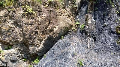 本当に左右の色・形状が違った地層や褶曲した地層が見られ、ブラタモリ的な場所です。ただし落石も多く、この日も数個落ちていました。