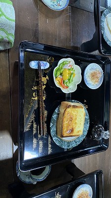 Gさんのご親戚から頂いた輪島塗の御膳で朝食を頂きました。場所は、いろりのあった場所です。いろりを出すことも可能なのですが