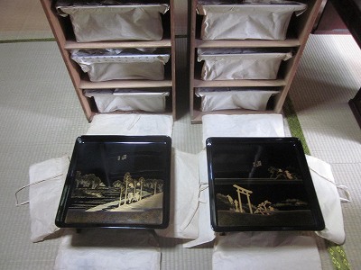 また、この古民家向けに輪島塗の御膳をGさんのご親戚から譲っていただきました。東海道五十三次が蒔絵として描かれており、