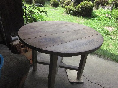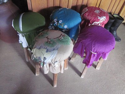 テーブルは、本家から頂いたものを家内が一生懸命米ぬかで拭きました。椅子は風呂敷でカバーしています。