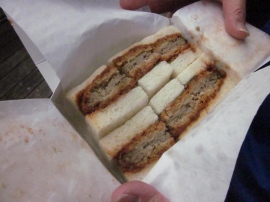 【 同じく小さいのが「ヒレカツサンド」¥750、 万世どら焼き¥260、万かつソースせんべい¥162(税込み) 】